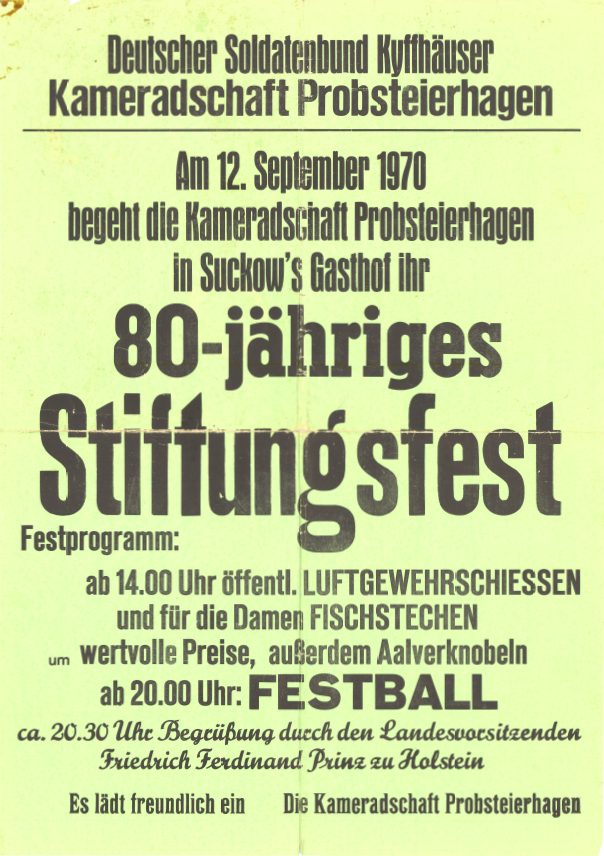 Am 12. September 1970 fand das 80-jährige Stiftungsfest der Kameradschaft Probsteierhagen in Suckow's Gasthof statt. Neben öffentlichem Luftgewehrschießen und anderen Aktionen, gab es am Abend einen Festball, zu dem auch Friedrich Ferdinand Prinz zu Schleswig-Holstein-Sonderburg-Glücksburg anwesend war.